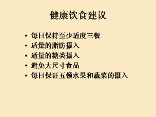 健康饮食建议包括每日保持至少适度三餐,适量的脂肪摄入,适量的糖类摄入,避免大尺寸食品以及每日保证五顿水果和蔬菜的摄入