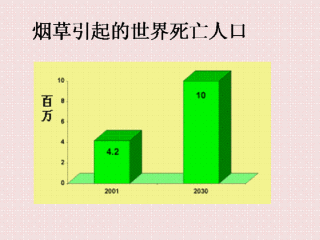 万。死于烟草引起的疾病的人口将多过死于爱滋、肺结核、车祸、母系遗传病、谋杀和自杀人口的总和。
