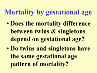 | Usually twins have a shorter gestational age (GA). Though the increased perinatal, neonatal and infant mortality risks among twins are well-known, the differences in mortality between twins and singletons by gestational age are not. A comparison of mortality by GA can help to understand the pathway of growth and development of twins. |