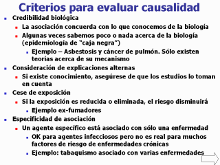 de riesgo ocurre antes del ataque de la enfermedad 2. Credibilidad biológica – algunas veces sabemos, otras no 3. La relación es verificada en estudios repetidos 4. Eliminación de explicaciones alternas: difícil de probar un efecto negativo 5. Cese de efecto: el riesgo cae en ausencia de exposición al factor de riesgo 6. Fuerza de asociación: usualmente medida a través del riesgo relativo.. Entre mayor el riesgo relativo, más probable que sea causal 7. Especificidad de la asociación : exposición específica asociada con sólo una enfermedad – No es aplicable, como se mostró en la discusión previa del esquema de causalidad, 8. Fuerte evidencia relación causal dosis-respuesta |