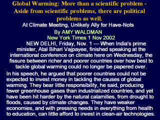 At Climate Meeting, Unlikely Ally for Have-Nots By AMY WALDMAN New York Times 1 Nov 2002 NEW DELHI, Friday, Nov. 1 — When India's prime minister, Atal Bihari Vajpayee, finished speaking at the international conference on climate here on Wednesday, the fissure between richer and poorer countries over how best to tackle global warming could no longer be papered over. In his speech, he argued that poorer countries could not be expected to invest money in tackling the causes of global warming. They bear little responsibility, he said, producing fewer greenhouse gases than industrialized countries, and yet have been hit harder by the natural calamities, from drought to floods, caused by climate changes. They have weaker economies, and with pressing needs in everything fHis speech articulated sentiments — resentments, in some cases — widely shared among developing nations. So while it produced little new of substance, the conference, the eighth since the United Nations Framework Convention on Climate Change was adopted in 1992, illuminated the challenges in crafting a global response to global warming. It highlighted a divide between north and south, between the industrialized and developing worlds, over who should bear the obligations and burdens of trying to reduce the emissions that cause global warming. But on several points, the south found itself with an unlikely ally: the United States, which under the Bush administration has also blanched at joining efforts to reduce emissions. Instead, the United States joined India and other developing countries in encouraging a focus on developing the technology and finding the resources to adapt to climate change. rom health to education, can little afford to invest in clean-air technologies. |