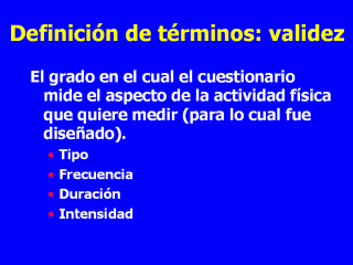 el cuestionario mide para lo que fue diseñado?” - Validez implica que una comparación es hecha con un estándar, aunque típicamente imperfecto, estándar superior. - Un estudio de validación puede y debe evaluar lo que evalúa el cuestionario del tipo de actividad. Ejemplos de diferentes tipos de actividad incluyen actividad recreacional como ejercicio, actividad ocupacional, actividad en el hogar, también la atención a niños. - Los estudios de validación, también deberán evaluar la frecuencia en el cuestionario – que tan frecuente se realiza la actividad, su duración – que tanto dura haciéndolo en cada sesión así como su intensidad – del esfuerzo gastado para conducir la actividad. |