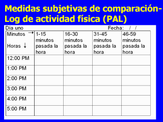 actividad física. - Por cada intervalo de 15 minutos de cada hora del día, los participantes registran su actividad en el momento (por ejemplo, nadar) o codifican lo correspondiente a la intensidad de su actividad (e.g., “1”=inactivo, “2”=intensidad leve, “3”=intensidad moderada). |
