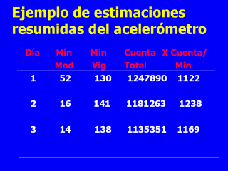 fueron mostrados en la diapositiva anterior. - Note la variabilidad diaria en minutos usados en categorías moderada e intensa, cuenta total y cuenta promedio por minuto. - Así, es deseable reunir al menos 7 días de actividad del acelerómetro y tomar ventaja de los días que representan la actividad física usual. - Examen inicial de días semanales contra fin de semana, también se recomienda. |