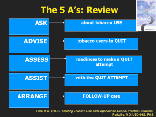 | As a final review, the 5 A’s are Ask about tobacco use. Advise tobacco users to quit. Assess readiness make a quit attempt. Assist with the quit attempt. Arrange follow-up care. Each of these is a key component of comprehensive tobacco cessation counseling interventions. Slide is used with permission, Rx for Change: Clinician-Assisted Tobacco Cessation. Copyright © 1999-2007 The Regents of the University of California, University of Southern California, and Western University of Health Sciences. All rights reserved. |