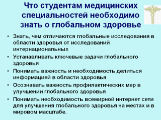 Медицинские студенты должны изучать важную концепцию глобального здоровья. Глобальное здоровье шире отдельных проблем и болезней, даже таких опасных, как  малярии, туберкулеза или СПИДа. Глобальное здоровье шире здоровья отдельной страны или региона. Глобальное здоровье преступает все возможные границы. Глобальное здоровье охватывает все факторы, касающиеся нашего здоровья.
