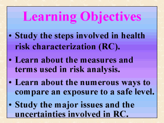 estimated in HEA to a level determined in TA as insignificant. Students will then learn about the dozen or more measures that are used to quantify health risk. They will also be introduced to the numerous ways in which an estimated exposure level can be compared to a level pre-established as safe. Finally, student will learn that as a quantitative process, RC involves a great deal of uncertainties. The main task of TA is to identify and determine the toxic endpoints of concern and to quantify their significance level. The issues involved in TA are complex and full of uncertainties because direct, quantifiable toxicity data from human studies are almost always unavailable. HEA, which was discussed extensively in the last two lectures, involves principally the estimation of human exposure to environmental contaminants. The issues involved in HEA are likewise enormous and even more overwhelming, given that its overall framework is more vulnerable. |