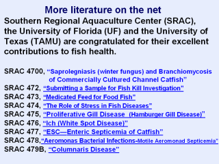UF/IFAS Fact Sheet FA-114 Common Freshwater Fish Parasites Pictorial Guide: Acanthocephalans, Cestodes, Leeches, and Pentastomes. http://edis.ifas.ufl.edu/FA114 UF/IFAS Fact Sheet FA-115 Common Freshwater Fish Parasites Pictorial Guide: Crustaceans. http://edis.ifas.ufl.edu/FA115 UF/IFAS Fact Sheet VM-104 Cryptobia iubilans in Cichlids. http://edis.ifas.ufl.edu/VM077 UF/IFAS Fact Sheet VM-67 Management of Hexamita in Ornamental Cichlids. http://edis.ifas.ufl.edu/VM053 UF/IFAS Fact Sheet VM-77 Use of Formalin to Control Fish Parasites. http://edis.ifas.ufl.edu/VM061 UF/IFAS Fact Sheet VM-78 Bath Treatment for Sick Fish. http://edis.ifas.ufl.edu/VM037 UF/IFAS Fact Sheet VM-85 "Red Sore Disease in Game Fish. http://edis.ifas.ufl.edu/VM059 UF/IFAS Fact Sheet VM-86 Use of Salt in Aquaculture. http://edis.ifas.ufl.edu/VM007 UF/IFAS Fact Sheet VM-87 Sanitation Practices for Aquaculture, http://edis.ifas.ufl.edu/AE081 |