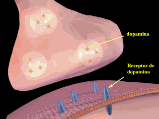| Esta diapositiva y la que sigue, muestran como trabaja la neurotransmisión de dopamina. El esquema corresponde a una terminación nerviosa (arriba), el espacio sináptico o e4spacio entre las neuronas, y la porción post-sináptica o receptora de una dendrita de una neurona vecina. Dopamina está contenida en vesículas (sitios redondos de almacenamiento) en la terminal nerviosa: los receptores de dopamina están presentes en la neurona receptora (abajo). |