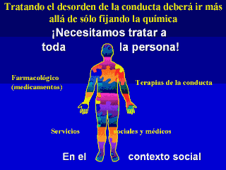 | Adicción requiere tratamientos que tomen en cuenta la complejidad. El tratamiento de abuso de sustancias deberá enfocarse en toda la persona y puede incluir medicamentos, terapias de la conducta y servicios auxiliares de apoyo. |