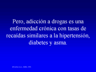 | Pero medicamentos solos, no son suficientes, La adicción a drogas, como otras enfermedades crónicas, recidivantes requiere tratamientos a largo plazo de sus variadas consecuencias. La meta del tratamiento es ayudar a las personas a llegar a un punto en que puedan ellos mismos manejar sus recuperación a largo plazo, incluyendo la abstinencia a drogas. |