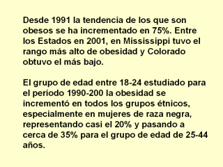 el 1999 al 2001, a continuación se reseña la obesidad y sobrepeso: --76.6% de hombres y 61.1% de mujeres se reportan con IMC de 25 o más. --En general 34.5% tuvieron sobrepeso pero no obesos, y el 34.2% fueron obesos. Entre estos el 38% tuvieron sobrepeso, el 38.6% de obesos fueron hombres y el 31.1% con sobrepeso y el 29.7% de obesos fueron mujeres. |