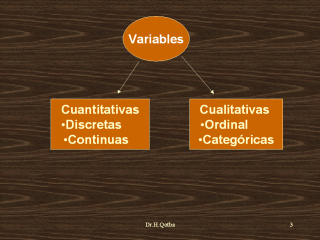 | Datos cuantitativos: los valores son numéricos Datos cualitativos: los valores pueden ser situados en distintas categorías de acuerdo a alguna característica o atributo. Discretas: el valor puede ser contado como número de hermanos Continuas: asumen todos los valores entre dos valores como temperatura corporal (la temperatura puede ser 36.7 pero no puedes tener 2.5 hermanos) Ordinal: caracterizada en términos de ranking de mejor a peor, pero los datos no son medidos en términos de escalas continuas, como condición médica (leve, moderada o severa). Categórica: no tiene escala de medición, como grupo sanguíneo (A, B, AB, O) |