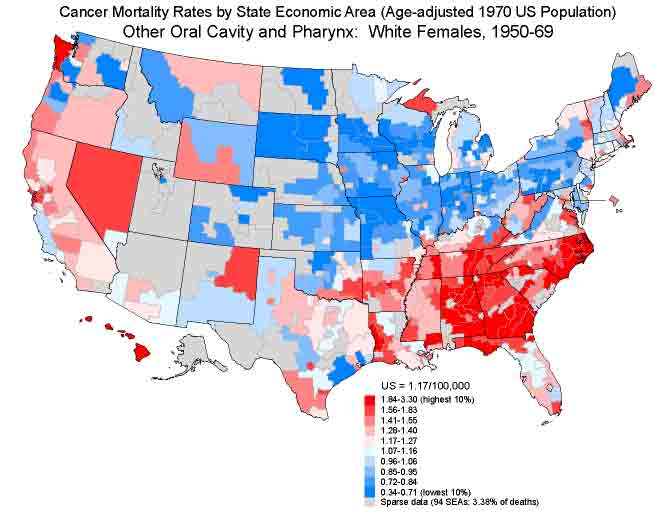 | We were also struck by the patterns for cancer of the oral cavity and pharynx among women which showed clusters of elevated mortality in rural southern areas. In a case-control study in North Carolina, we found substantially elevated risks that were associated with the long-standing practice of snuff dipping, rising to 50-fold for tumors of the gum and buccal mucosa, which are the tissues in direct contact with the smokeless tobacco. |