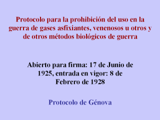 sus respectivos gobiernos: Ya que el uso en la guerra de gases asfixiantes, venenosos u otros, y todos los líquidos, materiales o aparatos análogos, han sido justamente condenados por la opinión general del mundo civilizado; y ya que la prohibición de tales uso ha sido declarada en Tratados para los cuales la mayoría de los poderes del mundo son partes; y para que esta prohibición sea universalmente aceptada como parte de la Ley Internacional, uniendo la conciencia y la práctica de las naciones; Declaro: Que las partes actuantes ya que no son Partes de tratados prohibiendo tal uso, aceptan esta prohibición, aceptando extenderla a la prohibición del uso de métodos biológicos de guerra y aceptan estar ligados de acuerdo a los términos de esta declaración. Las partes firmantes realizarán esfuerzos para inducir a otros estados a acceder al presente Protocolo. Tal acceso será notificado al Gobierno de la República de Francia,y más tarde a todos los firmantes y poderes, y tomará efecto en la fecha de la notificación al Gobierno de la República de Francia. El presente protocolo, del cual los textos en inglés y francés so auténticos, será ratificado tan pronto sea posible. Deberá llevar la fecha de hoy. Las ratificaciones al presente protocolo serán dirigidas al Gobierno de la República de Francia, el cual notificará cada una de las ratificaciones a los poderes firmantes. Los instrumentos de ratificación y acceso al presente protocolo permanecerán depositados en los archivos del Gobierno de la República Francesa. El presente protocolo entrará en vigor a la fecha de cuando cada poder firmante deposite su ratificación, y, de ese momento, se unirá a otros poderes que ya han depositado sus ratificaciones. Con testigos, los Plenipotenciarios han firmado el presente protocolo. Hecho en Génova, una copia, el día diecisiete de Junio de mil novecientos veinticinco. |