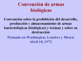 y su destrucción. Armas químicas y biológicas han estado asociadas generalmente entre ellas en la mente del público, y el extenso uso de gas venenoso en la Primera Guerra Mundial (resultando en más de un millón de víctimas y más de 100,000 muertes) dio lugar al Protocolo de Génova de 1925 prohibiendo el uso de gas venenoso y métodos bacteriológicos en la guerra. En la Conferencia de Desarme 1932-27, se realizaron intentos infructuosos para llegar a un acuerdo que prohibiría la producción y almacenamiento de armas químicas y biológicas. Durante la Segunda Guerra Mundial, nuevos y más gases tóxicos fueron desarrollados, e investigación y desarrollo se inició sobre armas biológicas. Ninguna parte usó tales armas. El Presidente Roosevelt, en una alerta a los poderes del eje contra el uso de armas químicas, declaró: El uso de tales armas ha sido declarado ilegal por la opinión general de la humanidad. Este país no las ha usado, y espero que nunca será obligado a usarlas. Señalo categóricamente que nunca las usaremos bajo ninguna circunstancia, a menos que sean usadas por nuestros enemigos. En las negociaciones de desarme general de la post-guerra, las armas químicas y biológicas usualmente consideradas juntas con armas convencionales y nucleares. Los EUA y la URSS, en las sesiones de 1962 del Comité de Desarme de Dieciocho Naciones ofreció planes general y completo desarme que incluía previsiones para eliminar armas biológicas y químicas. Un tema que obstaculizó grandemente el progreso fue sin las armas químicas y biológicas deberían ser unidas. Un borrador británico de la Convención sometido al ENDC el 10 de Julio de 1969, se concentró sólo en la eliminación de armas biológicas. Un borrador de la Convención propuesto a la Asamblea General por la Unión Soviética y sus aliados el 19 de Septiembre, trató con armas químicas y biológicas. El representante soviético arguyó que ellos habían sido tratados juntos en el Protocolo de Génova y en las resoluciones y reporte de la Asamblea General, y deberían continuar siendo tratados con el mismo instrumento. Una convención separada sobre armas biológicas, el previno, podría servir para intensificar la carrera armamentista química. Los Estados Unidos apoyaron la posición británica y señalaron la diferencia entre los dos tipos armas. A diferencia de las armas biológicas, las armas químicas han sido usadas en la guerra moderna. Muchas estados mantuvieron armas químicas en sus arsenales para disuadir el uso de este tipo de armamento contra ellos, y ofrecer una capacidad retadora si la disuasión falló. Muchos de estas naciones, señalaron los EUA, podría ser renuentes a renunciar a esta capacidad sin un aseguramiento de que otras naciones no estuvieren desarrollando, produciendo, almacenando armas químicas. Mientras los Estados Unidos no consideraron la prohibición de uno de estas clases de armas menos urgentes o importantes que otras, sostuvieron que armas biológicas presentaban menos problemas insalvables y un acuerdo sobre la prohibición de ellos no debería ser retardada hasta que un acuerdo sobre la prohibición de las armas químicas, pudiera ser alcanzado. Poco después de que el Presidente Nixon, accedió al cargo, ordenó revisar la política y programas de EUA en cuanto armas biológicas y químicas. El 25 de Noviembre de 1969, el Presidente declaró que los Estados Unidos, unilateralmente, renunciaban al uso primario de agentes y armas químicos incapacitantes o letales e incondicionalmente renunciaban a todos los métodos de guerra biológica. De aquí, el programa biológico de los EUA debería ser confinado a investigación sobre mediciones estrictamente definidas de defensa, tales como inmunización. Se le ordenó al Departamento de Defensa para diseñar un plan para la eliminación de agentes y armas biológicas almacenados existentes. El 14 de Febrero de 1970, la Casa Blanca anunció extensión de la prohibición a toxinas (substancias que están entre biológicos y químicos en la forma en que actúan como químicos pero son producidos por procesos biológicos o microbianos). La acción de EUA fue ampliamente aceptada internacionalmente, y el ejemplo fue seguido por otros. Canadá, Suecia, y el Reino Unido señalaron que ellos no tenían armas biológicas y no intentaban producir ninguna. Fue generalmente reconocido, sin embargo, que acciones unilaterales podrían no efectuarse de no ligarse a un compromiso internacional. Varias naciones, incluida la Unión Soviética y sus aliados, continuaron para favorecer un compromiso cubriendo armas biológicas y químicas. Discusión en la Asamblea General en 1970 y la Conferencia del Comité de Desarme (CCD) – como la ENDC fue llamada después de su crecimiento a 26 miembros en Agosto de 1969 – no se produjo acuerdo. Una brecha apareció el 30 de Marzo del 1971, sin embrago, cuando la Unión Soviética y sus aliados cambiaron su posición e introdujeron una revisión al borrador de la convención limitada a agentes biológicos y toxinas. Luego se volvió posible que los co-directores del CCD – representantes de EUA y de la URSS – trabajaran en un borrador conjunto, como lo habían hecho los Tratados de no proliferación y Seabed. El 5 de Agosto, los Estados Unidos y la Unión Soviética sometieron textos idénticos pero separados. El 16 de Diciembre, la Asamblea General probó la resolución , con una votación de 110 a 0., elogiando a la c0onvención y expresando la esperanza de una más amplia posible adherencia. El representante francés se abstuvo, explicando que la convención , aunque es un paso adelante, podría debilitar la prohibición del protocolo de Génova sobre el uso de armas químicas, y no consideraba que controles internacionales adecuados se ofrecieran. Anunció, sin embargo, que el gobierno francés podría enactar legislación doméstica prohibiendo armas biológicas, y esto se hizo en en Junio del 