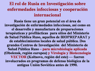 Unidas. A través del Ministro Ruso de Ciencia y tecnología, el Ministerio Ruso de Salud Pública y RAO "BIOPREPARAT", ambos Centros de Obolensk y Koltsovo están activamente involucrados en amplias colaboraciones internacionales. Estas colaboraciones están bajo organizaciones como el Centro de Ciencia y Tecnología Internacional (ISTC, CE+EUA+Japón), Academia Nacional de Ciencias EUA (NAS), Asociación para la Promoción de la Cooperación con Científicos de Estados Nuevos Independientes de la AUS (INTAS, EC), Fundación de Investigación Civil y Desarrollo (CRDF, EUA), Iniciativas para la Prevención de la Proliferación (IPP-DOE, EUA), Administración Nacional del Espacio y Aeronáutica (NASA, EUA), Agencia de Proyectos de Investigación Avanzada de Defensa (DARPA, EUA). Estas colaboraciones internacionales están enfocadas a la no proliferación y reducción de la amenaza fortaleciendo las medidas de confianza y transparencia, pero no involucra uso dual de tecnologías. En 1997 un grupo de expertos de la Academia Nacional de Ciencias de EUA (NAS) bajo el liderazgo del Prof. Joshua Lederberg y Dr. John Steinbruner, con el involucramiento de expertos rusos, desarrollaron un concepto para la colaboración internacional en investigación de patógenos peligrosos [9]. Este concepto usa las medidas de confianza y transparencia extensamente. En particular, cada proyecto debería tener libertad de acceso al sitio de realización y todos los resultados deben ser ofrecidos a todas las partes. El trabajo de colaboración entre científicos de Rusia y EUA deberá ser efectuado en laboratorios de esos países bajo acuerdos separados. Esta libertad de acceso es también definida en programas tales como CRDF, NASA, DARPA y IPP (DOE). |