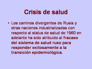 preventiva actual. El sistema antiguo ruso de prevención, con su orientación médica primaria, no evolucionó a una promoción basada en la población. |