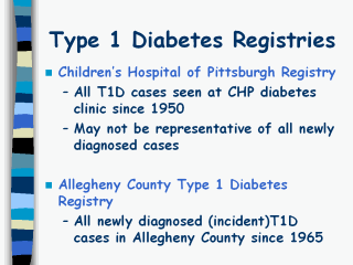 The second registry includes all newly diagnosed T1D cases (<20 years of age) in Allegheny County, PA since 1965. Most cases are diagnosed at CHP – but this registry includes children diagnosed at the other hospitals in Allegheny County. We use this registry to determine the incidence and characterize the descriptive epidemiology of T1D since it is unbiased.