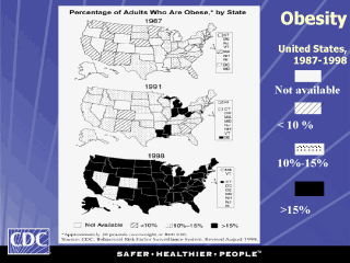 | Percentage of Adults Who Are Obese*, by State * Approximately 30 pounds overweight or BMI>=30 Source: CDC, Behavioral Risk Factor Surveillance System. Revised August 1999. |