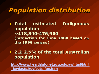 More than half of the total Indigenous population of Australia are residents in metropolitan areas and large towns. This is particularly the case for NSW and Victoria. Qld also has a large Indigenous population, with a large proportion living in rural and remote areas. WA, SA and the NT have relatively smaller populations, but with a large proportion living in rural and remote areas. |