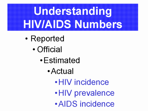 Thus, in measuring and monitoring HIV infections and AIDS cases and deaths, these different stages of HIV infection need to be kept in mind constantly. AIDS programs need to know how many persons may have acquired an HIV infection in a year (annual HIV incidence); how many persons are living with an HIV infection at the end of a year (HIV prevalence); and how many AIDS deaths occur in a year. HIV prevalence can be a number or rate of persons alive with an HIV infection. HIV prevalence is estimated in developed countries by a back calculation method from annual reported AIDS cases and in developing countries from HIV serologic data and is usually calculated for the 15-49 year old population and not for the total population. HIV incidence is the number of new HIV infections that occur each year. This number cannot be directly measured and is usually estimated by modeling. |