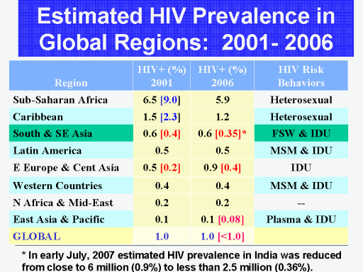 This table provides a summary of the estimated HIV prevalence and trends in major global regions since the new millennium.  All of the regional estimates are based on UNAIDS reports.  Estimates (blue numbers) within the black brackets [xx] are the initial UNAIDS estimates – i.e., in the 2001 update report, UNAIDS estimated HIV prevalence in SSA at 9% and then revised its 2001 estimate downwards to 6.5% in the 2003 update report. Estimates (red numbers) within the red brackets [xx] are my “unofficial” estimates – i.e., I believed that HIV prevalence was grossly overestimated in SE Asia (at least a couple of million overestimated in India alone) and in Eastern Europe.  UNAIDS was forced to accept a revised estimate of 2.5 million for India in early July, 2007. The take home message is that even using UNAIDS’ official estimates, the AIDS pandemic is not “ever increasing and expanding.” The only region where estimated HIV prevalence seems to be increasing is Eastern Europe but my biased view is that perhaps HIV prevalence may be increasing in this region, but the estimates for this region are also grossly overestimated!