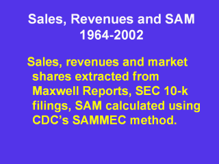 | To give an overall impression of the industry’s activities since the 1964 Surgeon General’s report. A colleague, Dr Roxanne Kendall and I calculated total US sales, revenues and Smoking Attributable Mortality per company. |
