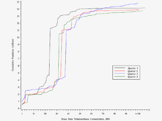 Cumulative frequency distribution of population with respect to mean Total Trihalomethane concentration for New York State-Richter EPHT Water Group