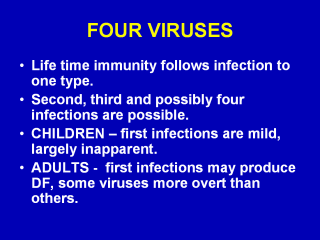 | The four dengue viruses, members of the flavivirus genus, evolved from a common ancestor in subhuman primates and separately were introduced into the urban transmission cycle. |