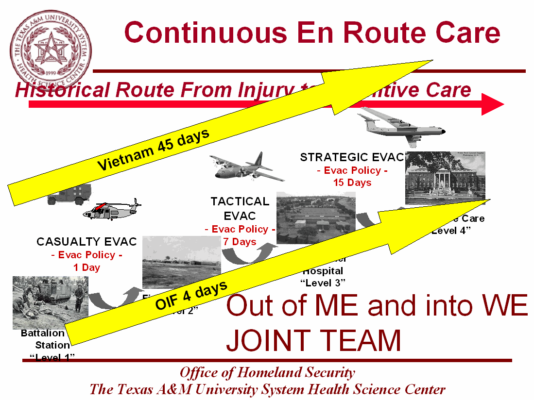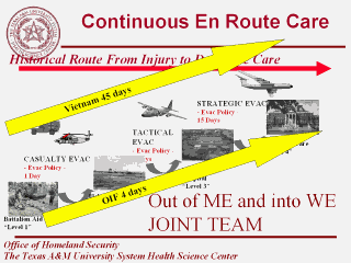 Historically, the route from injury to definitive care was quite prolonged. Level 1 care provides only minimal resuscitative or stabilization capability. Evacuation to a Level 2 field hospital capable of further stabilization could take up to a day and is termed Casualty Evacuation. Furthermore, it could take up to a week to get to a facility with significant surgical subspecialty capability such as a Level 3 theater hospital. This evacuation is called tactical evacuation. These facilities while transportable were large requiring significant airflow to move and were slow to build up and take down. Hence, as the conflict progressed and the front line moved, the distance from the point of wounding to Level 3 care could become quite significant. Finally, it could take up to two weeks to get someone out of theater to a Level 4 definitive care facility. Survival from significant injuries was difficult with this timeline.