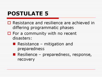 If a community has not experienced a disaster, resistance is built through mitigation and preparedness activity. Resilience is achieved through preparedness measures, by well planned response, and by pre-planning and organization for recovery in advance of any disaster. |