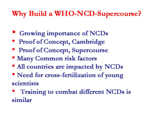 It is time to build the WHO-NCD-Supercourse training program. NCDs continue to rise. The Supercourse allows us to share content and train the trainer. We need to establish programs to cross-fertilize young scientists across disciplines and across the world. |