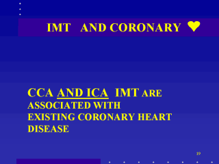 with angiography(9). - Cholesterol Lowering Atherosclerosis Study (10) confirm that measurement of progression of intima-media thickness in the distal common carotid artery is a useful surrogate end point for clinical coronary events : for each 0,03mm increase per year the relative risk for any coronary event is >3. - Intima media thickness of the common carotid artery and the internal carotid artery is associated with the risk of myocardial infarction in older adults without history of cardio-vascular disease ( Cardiovascular Health Study) with a relative risk of 3,87 between lowest and highest IMT(8). |