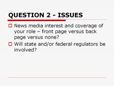 regulatory scrutiny? Although this question would seem to be a clearly business oriented one, governmental agencies and non-governmental organizations have very similar concerns. Negative news coverage on the front page is bad for business; in government it is embarrassing for the elected officials responsible for the agency – and that will have repercussions. Similarly businesses do not like to have regulatory agencies attracted to their problems. For government agencies, legislative or audit agency investigations are equally negative and distracting. |