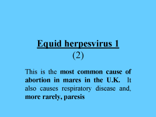 | Diagnosis Virus may be recovered by culture on equine monolayers, using samples from nasal swabs, leucocytes, or foetal liver/lung/ thymus/spleen. Frozen sections of foetal tissues and fluorescent immunostaining are also routinely used.A nested PCR for the envelope glycoproteins in nasal swab has been developed and is more sensitive than virus isolation. Control Both inactivated (formalin) and attenuated vaccines are available in the U.K. While it is maintained by some practitioners that regular use (6 monthly or more frequently) reduces respiratory disease, neither vaccine will protect against experimental challenge with abortogenic virus. Jockey Club regulations stipulate no movement for at least 1 month after the last abortion in an outbreak. Movement must then only be to the original breeding stables. |