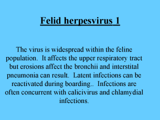 During the first week nasal swabs can be cultured on feline cells to produce syncytia and intranuclear inclusions, but not many labs are equipped to do this. Several vaccines are available including killed and live attenuated preparations. Some of the live vaccines are given intranasally and may provoke clinical symptoms eg in immunosuppressed kittens with FIV or FeLV. |