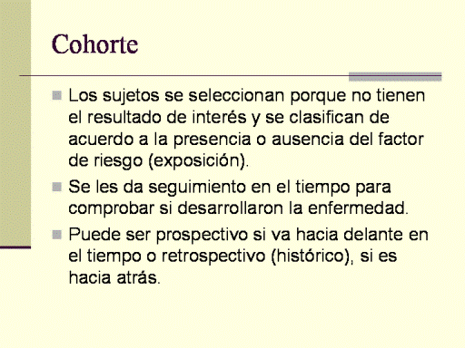 Una cohorte es un grupo de sujetos o cosas que tienen algo en común y no presentan el resultado de interés.