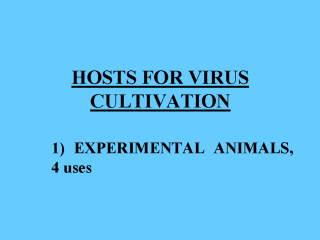 virus in suckling mice. (b) Pathogenesis studies: to prove that a particular virus causes a specific disease, Koch’s postulates, and to establish which tissues are richest in virus for diagnosis. (c) Vaccine development: to prove efficacy. Laboratory animals may be used if a lab. animal model is available and appropriate, before trials in the target species. (d) Serology: horses, rabbits & goats used to provide virus-specific antibodies. Mice for monoclonal antibodies. |
