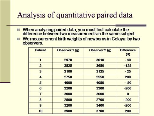 Observing the differences, we found that most of them are negative, suggesting that the second observer tended to registered higher weights. Now the column of differences is our sample. |