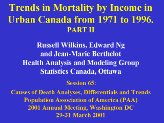 | Did you see the Part I of this lecture? This is a study of trends in mortality by neighbourhood income. The objective was to determine if income-related differentials in mortality have diminished as expected since the introduction of publicly-funded universal health insurance in Canada in the early 1970s. I'm Russell Wilkins. My co-authors are Jean-Marie Berthelot and Edward Ng. We're all from the Health Analysis and Modeling Group at Statistics Canada. |