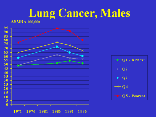 For lung cancer among males, there was little net change in either the disparities or levels of mortality.