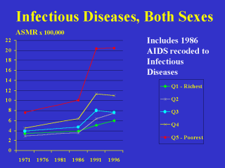 | Mainly because of AIDS, mortality rates from infectious diseases increased substantially, particularly from 1986 to 1996, and the gradient by income became steeper. |