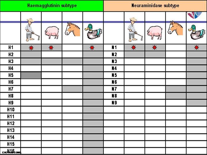 ویروسهای آنفلوانزای A در حیوانات بسیار مختلفی از جمله اردک ها,جوجه ها,خوک ها,نهنگ ها ,اسبها و شیرهای دریایی یافت می شوند. 16زیرگروه متفاوت هماگلوتینین و 9 زیرگروه متفاوت نورآمینیداز, وجود دارد که همه آنها در ویروسهای آنفلوانزای تیپ A در پرندگان وحشی یافت می شوند. پرندگان وحشی اولین مخازن برای همه زیرگروه های ویروسهای آنفلوانزای تیپ A در طبیعت هستند و به نظر می رسد منشآ ویروسهای آنفلوانزای تیپ A در سایر حیوانات باشند. اغلب ویروسهای آنفلوانزا در پرندگان عفونت بی علامت یا خفیف ایجاد می کنند,البته طیف علایم در پرندگان به طور چشمگیری به نوع ویروس وابسته است. عفونت با انواع خاص آنفلونزای A )برای مثال ,برخی انواع ویروسهای 5 H و 7H( میتوانند در پرندگان وحشی و به خصوص پرندگان اهلی مثل جوجه ها و بوقلمون ها, به طور گسترده , باعث بیماری و مرگ شوند. خوکها میتوانند علاوه بر ویروسهای آنفلوانزای خوکی, با هر دو نوع ویروسهای آنفلوانزای انسانی و مرغی دچار عفونت شوند.خوکهای مبتلا دچار علائمی مشابه با انسانها (برای مثال : سرفه ,تب و آبریزش بینی) میشوند. از آنجایی که خوکها مستعد ابتلا به آنفلوانزای خوکی, انسانی و مرغی هستند,به صورت بالقوه ممکن است در یک زمان با انواع مختلف ویروس آلوده شوند(مثلاً نوع اردکی و نوع انسانی). اگر چنین اتفاقی رخ دهد,برای ژنهای این ویروسها این امکان ایجاد میشود که با هم مختلط شوند و ویروسی جدید ایجاد کنند. |