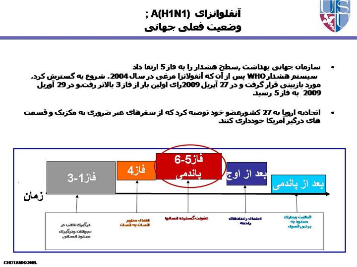 فاز 4 هنگامی رخ می دهد که گروههای درگیر بزرگی وجود داشته باشند(مثلاً <25 انسان بیمار که برای<2 هفته میماند), با انتقال محدود انسان به انسان,اما محل انتشار کاملاً محدود.طی این فاز,WHO دستورات متنوعی را اعلام میکند که هدف آن محدود کردن ویروس به یک منطقه و به تاخیر انداختن انتشار آن تا فراهم شدن امکاناتی مثل تولید واکسن علیه آن فاز 5 زمانی رخ میدهد که گروههای درگیر بزرگی وجود داشته باشند(مثلاً 50-25 انسان بیمار که برای4-2 هفته میماند ,اما انتقال انسان به انسان هنوز محدود است. در این زمان ادامه تلاشها برای محدود کردن انتشار ویروس الزامی است.تا هم امکانات کنترل فراهم شود و هم همه گیری جهانی رفع شود فاز 6 هنگامی است که انتقال به جمعیت عمومی افزایش یافته و مداوم است,و مفهومش این است که همه گیری جهانی وجود دارد. در این زمان همه تلاش ها باید معطوف به حداقل رساندن عواقب پاندمی باشد |