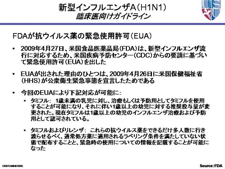 FDA、新型インフルエンザアウトブレイクへの対応としてインフルエンザ薬および診断テストの緊急使用許可を出す[ニュースリリース]。メリーランド州ロックビル。米国食品医薬品局。2009年4月27日。 http://www.fda.gov/bbs/topics/NEWS/2009/NEW02002.html. Accessed April 28, 2009.