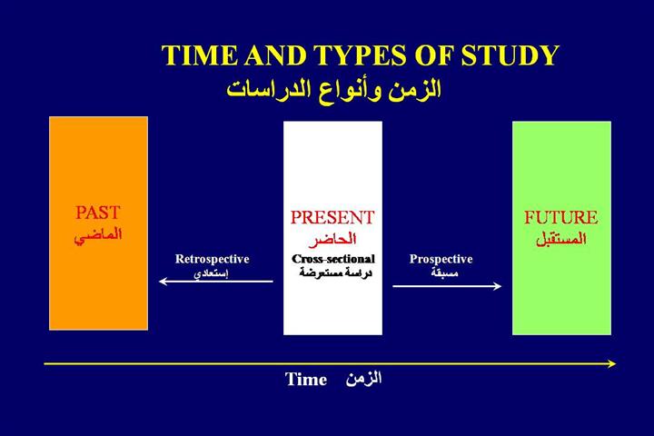 The concept of time is very important in determining the type of epidemiologic study to be done. If you are looking for the relationship of cause and effect during present time, you will need a cross-sectional study. However, if you are looking at the cause and effect relationship of the past, you will need a retrospective study. If you looking at the relationships in the future, you will need a prospective study. I will be lecturing on each one of these studies more in details presenting with the aid of the next few slides. إن عنصر الزمن مهم جداً في تحديد نوع الدراسة الوبائية المقرر تطبيقها. في حالة النظر في علاقة السبب و النتيجة في الوقت الحاي فسوف نستعمل دراسة مستعرضة. ولكن عند البحث عن علاقة السبب والنتيجة في الماضي سوف نحتاج دراسة استعادية. و في حالة البحث عن العلاقات في المستقبل سوف نحتاج إلى دراسة مسبقة . سوف أعرض تفاصيل كل دراسة على حده في الشرائح القادمة. |