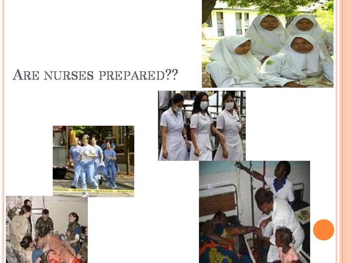 Worldwide nurses receive minimal training on disaster preparedness. The World Health Organization (WHO) report 2006 acknowledges that nurses lack knowledge and skills in disaster and recommends that nurses to be involved in planning, policy-making for disaster preparedness and response. Furthermore, WHO demonstrates that training nurses will have a great impact on risk reduction and response to a disaster. WHO (2006). The Contribution of nursing and midwifery in emergencies: report of a WHO consultation, WHO, Geneva. http://www.who.int/hac/events/2006/nursing_consultation_report_sept07.pdf |