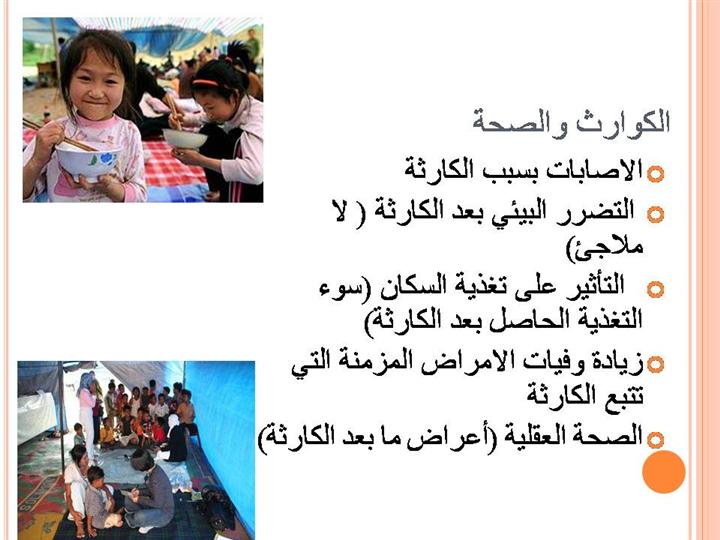 عواقب الكوارث تتراوح ما بين القصيرة والطويلة الأجل. ويمكن للتقييم الفعال إنشاء قاعدة لاتخاذ الإجراءات المناسبة. هذه يمكن أن تخدم بشكل جيد في تخفيف وطأة الكوارث وتعزيز التصدي لها.كما يسهم تعليم التمريض بحد ذاته في العافية النفسية وبنتائجه كذلك ، إلا أنه كما يبدو يعد مفتاح العافية الجسدية.