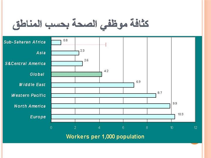 كثافة التمريض و القبالة في جميع أنحاء المنطقة موجودة في الشريحة. نلاحظ كثافة منخفضة وخاصة في كل من نيو غينيا ، وكمبوديا ، وغيرها ، وأيضا ما هو غير واضح في الجدول الفوارق في الكثافة الريفية /المناطق الحضرية ، والممرضون / القابلات ، وغيرهم من المهنيين الصحيين في المناطق الحضرية. |